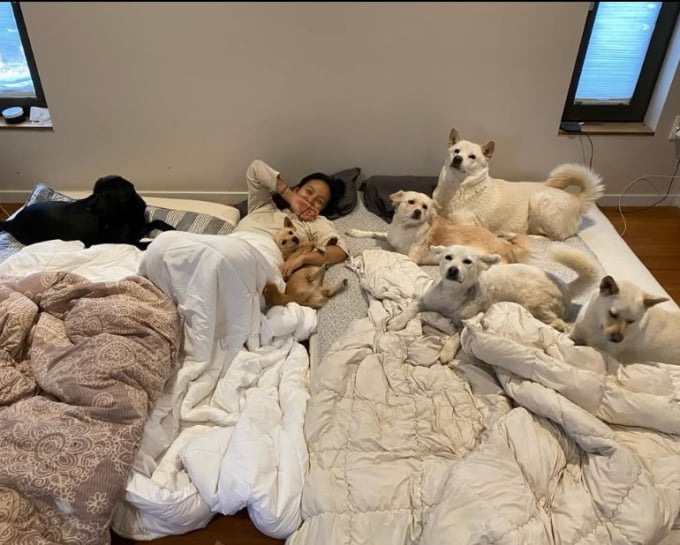 公開された写真には、部屋の床に広げられた布団とマットの上にペットたちが寝そべっている様子が収められていた。