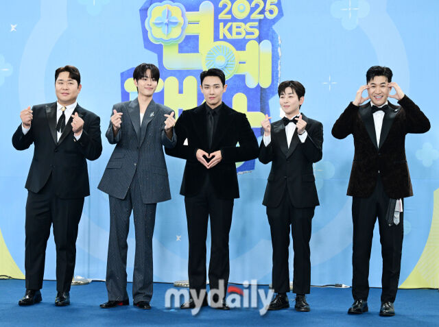 「1泊2日」のムン・セユン、ユ・ソンホ、イ・ジュン、ディンディン、キム・ジョンミン(左から)が20日、ソウル汝矣島のKBS新館ホールで行われた「2025 KBS芸能大賞」ブルーカーペットイベントに出席した。