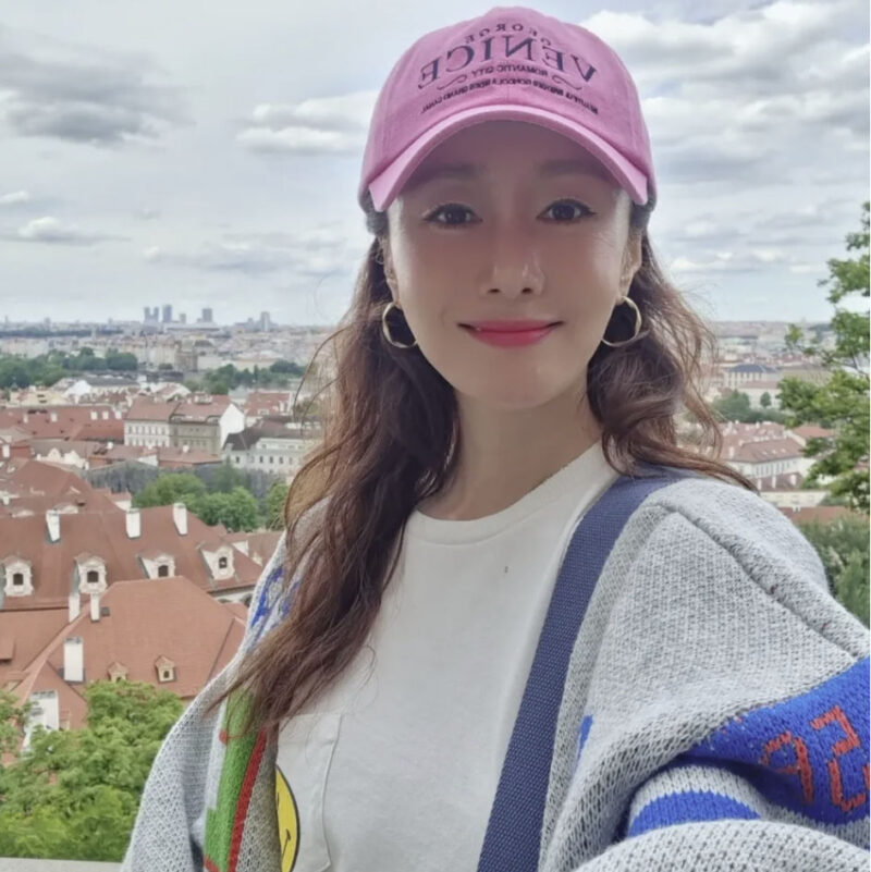 ピンクの帽子とカジュアルなスタイリングで、リラックスしながらも洗練された雰囲気を演出し、自然な笑顔で変わらぬ美貌を誇った。