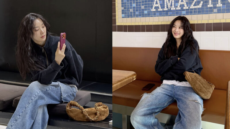 写真の中のイ・チョンアは、ブラックのハーフジップトップスにデニムパンツを合わせたリラックスした装いで、自然体な雰囲気を醸し出しています。