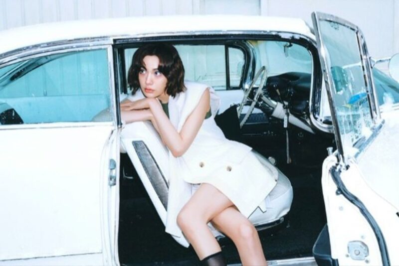 写真の中のナナは、車内に座り、水しぶきと泡でいっぱいのガラス窓の向こうを見つめ、幻想的な雰囲気を醸し出していました。水滴の間から覗く深い目元とブルーのレンズが神秘的な印象を加え、ほんの少しそらした視線の処理だけで強いストーリーを生み出しています。はっきりとした彫りの深い顔立ちと自然に乱れたウェーブヘアは、彼女特有の洗練された雰囲気を放ち、感嘆の声が上がりました。