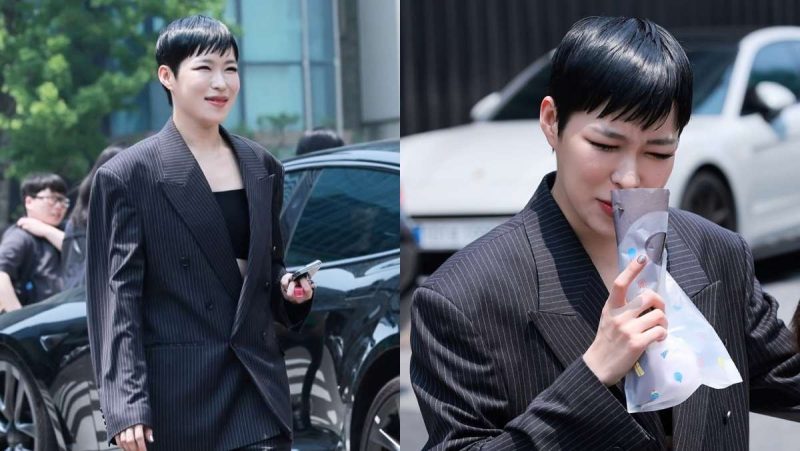 まず目を引くのはヘアスタイルだ。ヒョジンチョイは髪を非常に短くカットしたピクシーカットを演出。額の上に軽く流れる前髪と、しっとりとした質感で固定された髪が全体的な印象をシックにまとめている。 ブラックカラーの髪は顔の輪郭をはっきり際立たせ、無駄のないすっきりとしたカットラインが都会的な雰囲気を完成させる。髪の毛の先端にはジェルやワックスを活用して滑らかな光沢感を出し、眉と目元がよりくっきりと強調されるように演出した。