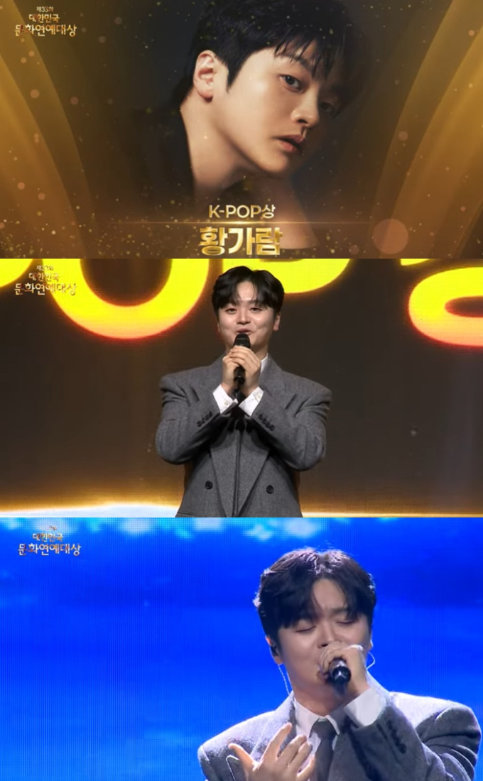 受賞後、ファン・ガラムは祝賀公演で全国民にヒーリングを与えた代表曲「私はホタル」を歌い、第33回大韓民国文化芸能大賞を輝かせた。ファン・ガラムは「私はホタル」を熱唱し、感動を与えると同時に、ハスキーボイスで深い余韻を残した。