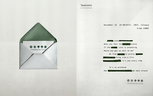 SEASONS」は、JUNNYが去る8月に発売した正規2集「null(ヌル)」以来、4ヶ月ぶりに披露する新曲であり、今年一年を締めくくるシングルだ。ジュニは去る14日、公式SNSを通じて、便箋と手紙の封筒を連想させるティーザー画像をサプライズ公開した。
