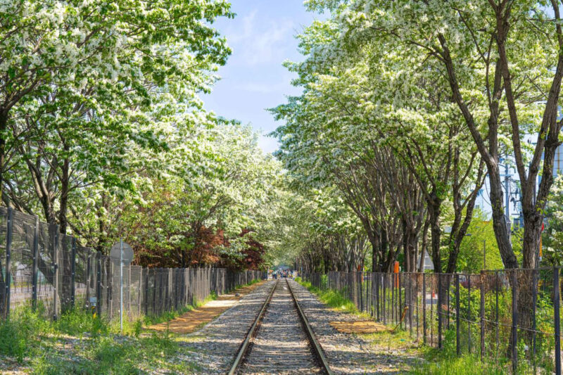 約600mにわたって続くヒトツバタゴの群落は、線路の両脇に枝を伸ばして天然の屋根を作ります。無骨な線路の質感と柔らかい白い花びらが対比をなす独特の風景のおかげで、毎年多くの写真家や旅行者が足を運びます。